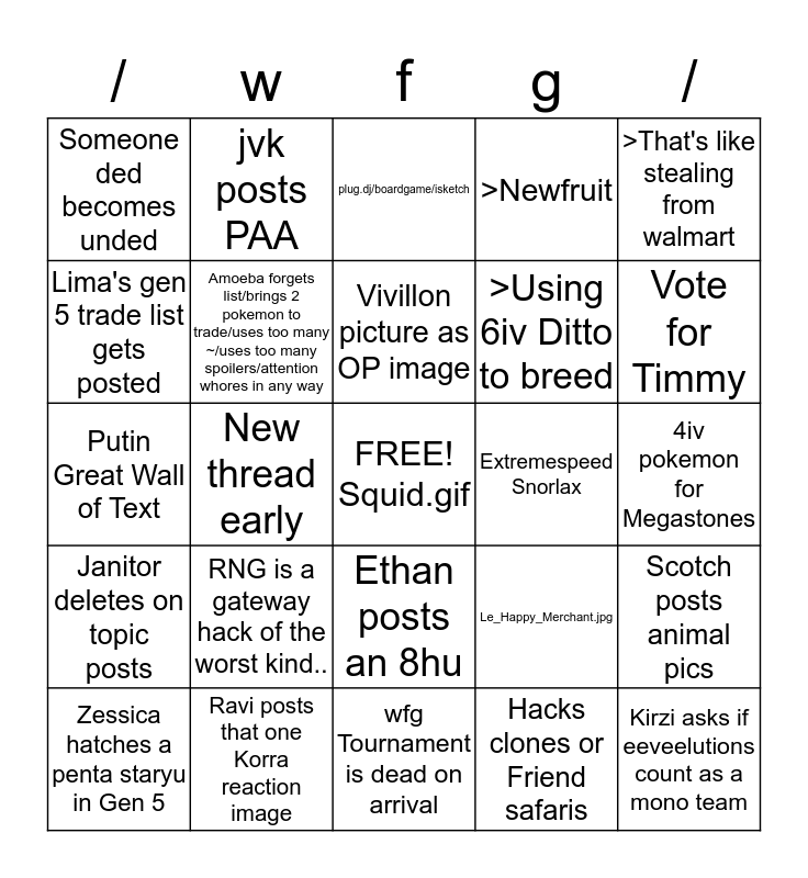 This bingo card has a free space and 24 words: RNG is a gateway hack of the worst kind.., Ravi posts that one Korra reaction image, Vivillon picture as OP image, Zessica hatches a penta staryu in Gen 5, >That's like stealing from walmart, Someone ded becomes unded, Lima's gen 5 trade list gets posted, jvk posts PAA, Extremespeed Snorlax, Ethan posts an 8hu, >Using 6iv Ditto to breed, Putin Great Wall of Text, Le_Happy_Merchant.jpg, Scotch posts animal pics, Amoeba forgets list/brings 2 pokemon to trade/uses too many ~/uses too many spoilers/attention whores in any way, Hacks clones or Friend safaris, 4iv pokemon for Megastones, plug.dj/boardgame/isketch, Vote for Timmy, New thread early, Kirzi asks if eeveelutions count as a mono team, Janitor deletes on topic posts, >Newfruit and wfg Tournament is dead on arrival.
