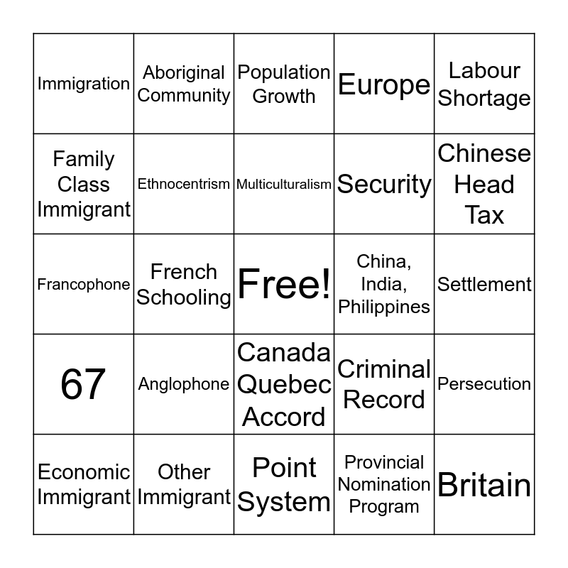 This bingo card has a free space and 29 words: Economic Immigrant, Refugee, French Schooling, Emigration, Immigration, Population Growth, Ethnocentrism, Anglophone, China, India, Philippines, Other Immigrant, Settlement, Britain, Point System, Provincial Nomination Program, Chinese Head Tax, Health, Canada Quebec Accord, 67, Labour Shortage, Francophone, Criminal Record, Singh Decision, Security, Family Class Immigrant, Europe, Aboriginal Community, Persecution, Multiculturalism and Franco Albertan.
