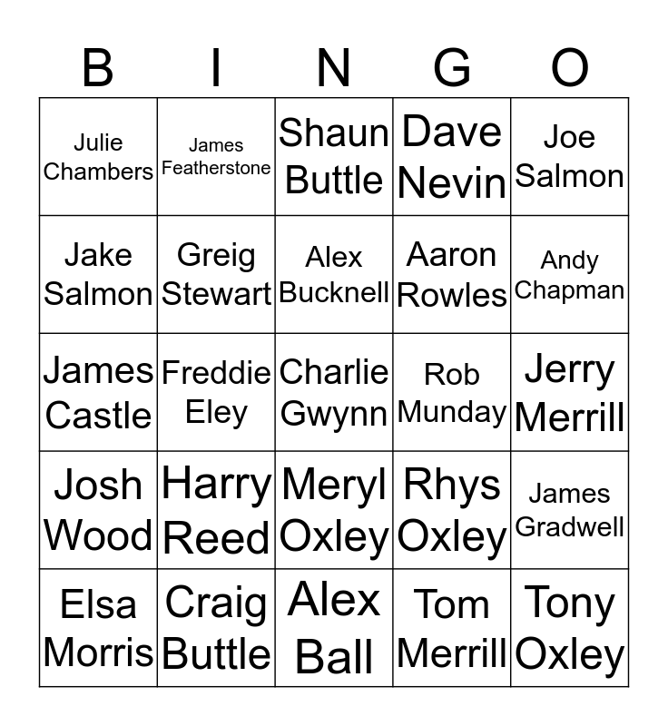 This bingo card has 75 words: Ed Kemp, Tom Hockenhull, Shaun Buttle, Rufus Bullough, Matt Burrell, Will Hughes, Charlie Kemp, Andy Slowgrove, Andy Sturman, Steve Plowman, Tony Oxley, David Illsley, Alex Bucknell, Jake Salmon, Ross Stewart, Freddie Eley, Fin Middleton, Charlie Gwynn, Steve White, Joe Salmon, Alex Chessell, James Castle, Greig Stewart, James Featherstone, Dave Nevin, Gregor McKenzie, Andy Mash, Richie Hunt, Matt Hunt, Steve Herbert, Joe Scutts, Asad Abbas, Connor Potter, Rhys Oxley, Andy Chapman, Aaron Rowles, Lee Rennison, Rich Mash, Jerry Merrill, Tom Merrill, Rich Featherstone, Ryan Goodyear, Ian Bass, Paul Schulpher, James Todd, Steve Wood, Elsa Morris, Julie Chambers, Julia White, Tracy Booth, Sharon Herbert, Meryl Oxley, Judith Cumming, Karen Barrow, Joanna Wood, Lucy Bucknell, Debbie Niziolek, Rachael Voaden, Duncan Potter, Sam Reed, Harry Reed, Ben Smith, Phil Smith, Tom Clark, Joeh Turner, Rob Munday, Seb Chambers, Max Watson, Matt White, James Gradwell, Josh Wood, Craig Buttle, Zach Herbert, Alex Ball and Ravi Chahal.