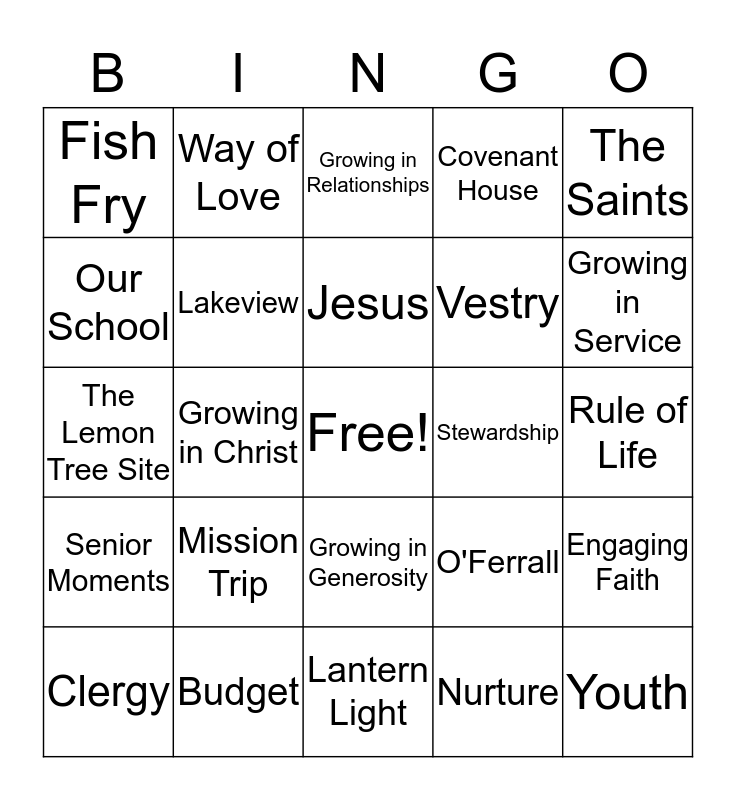 This bingo card has a free space and 24 words: Mission Trip, Budget, Jesus, Clergy, The Saints, Fish Fry, Our School, Way of Love, Stewardship, Growing in Generosity, Vestry, The Lemon Tree Site, O'Ferrall, Engaging Faith, Lakeview, Nurture, Rule of Life, Growing in Relationships, Growing in Service, Growing in Christ, Youth, Senior Moments, Covenant House and Lantern Light.