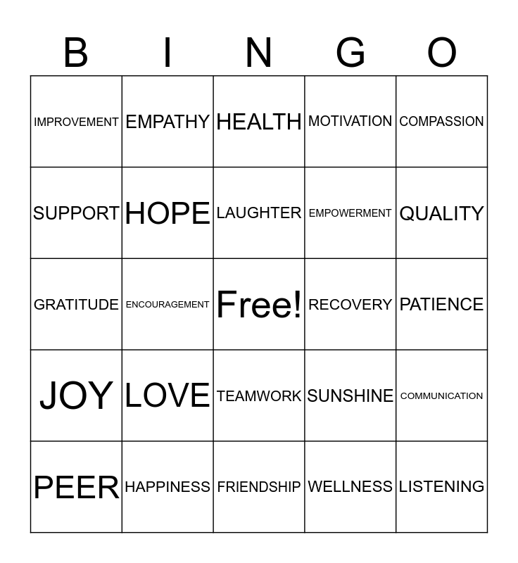 This bingo card has a free space and 24 words: LOVE, HAPPINESS, LAUGHTER, PEER, COMPASSION, IMPROVEMENT, SUPPORT, EMPATHY, RECOVERY, TEAMWORK, EMPOWERMENT, GRATITUDE, SUNSHINE, COMMUNICATION, HOPE, WELLNESS, PATIENCE, HEALTH, QUALITY, ENCOURAGEMENT, LISTENING, JOY, MOTIVATION and FRIENDSHIP.