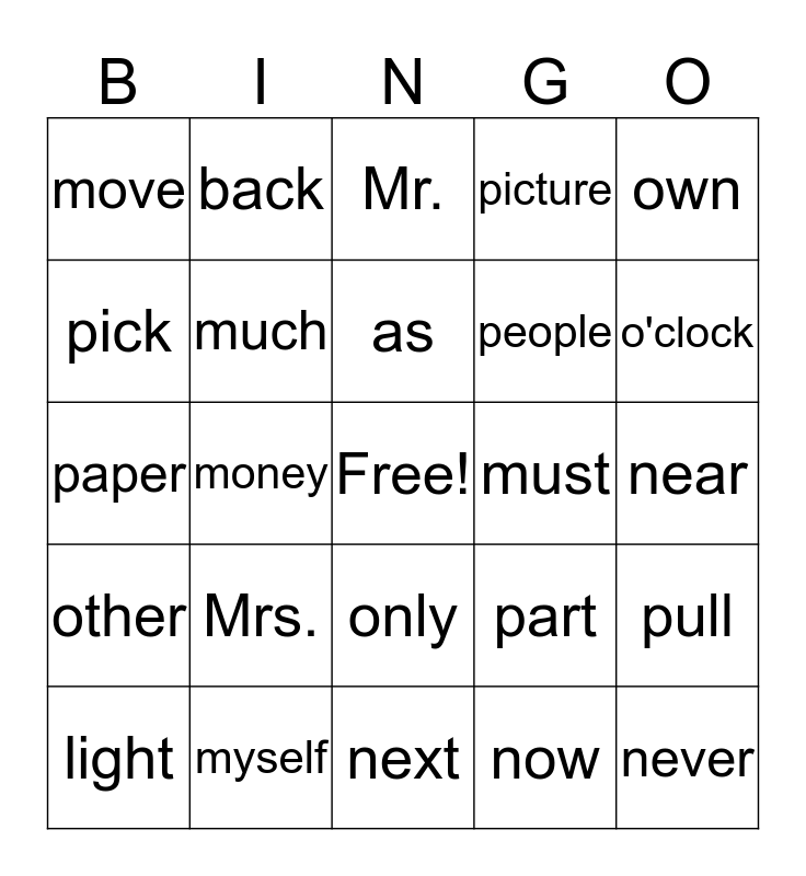This bingo card has a free space and 29 words: light, long, money, more, move, Mr., much, Mrs., must, myself, near, never, next, now, o'clock, of, only, other, own, paper, part, off, people, pick, picture, back, pull, as and shall.