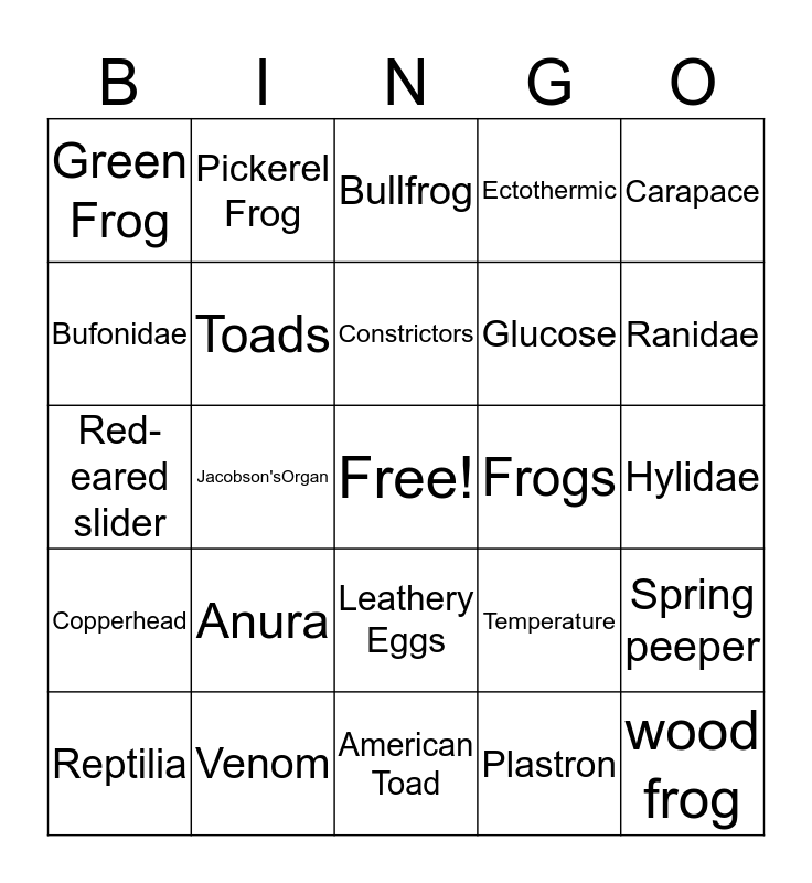 This bingo card has a free space and 24 words: Anura, Venom, Constrictors, Reptilia, Carapace, Green Frog, Bufonidae, Pickerel Frog, Frogs, Leathery Eggs, Glucose, Red-eared slider, Temperature, Spring peeper, Toads, Plastron, Hylidae, Bullfrog, Ranidae, Jacobson'sOrgan, wood frog, Copperhead, Ectothermic and American Toad.