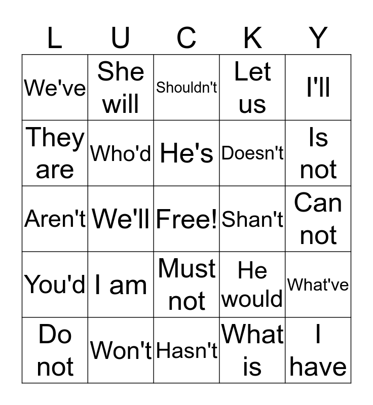 This bingo card has a free space and 24 words: I am, Won't, He's, Do not, I'll, We've, They are, She will, Shan't, Must not, Doesn't, Aren't, He would, What've, Who'd, What is, Can not, Shouldn't, Is not, We'll, I have, You'd, Let us and Hasn't.