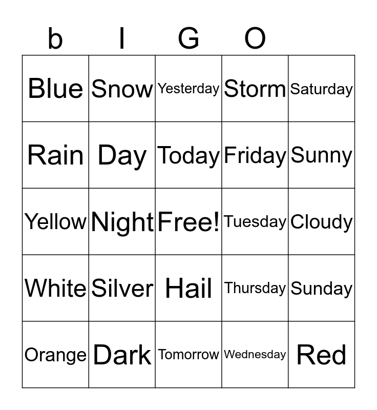 This bingo card has a free space and 29 words: Light, Dark, Yesterday, Sunday, Saturday, Blue, Day, Today, Tuesday, Sunday, Orange, Night, Wednesday, Red, Yellow, Green, Tomorrow, Thursday, Sunny, White, Silver, Daylight, Friday, Cloudy, Rain, Snow, Hail, Storm and Gloomy.