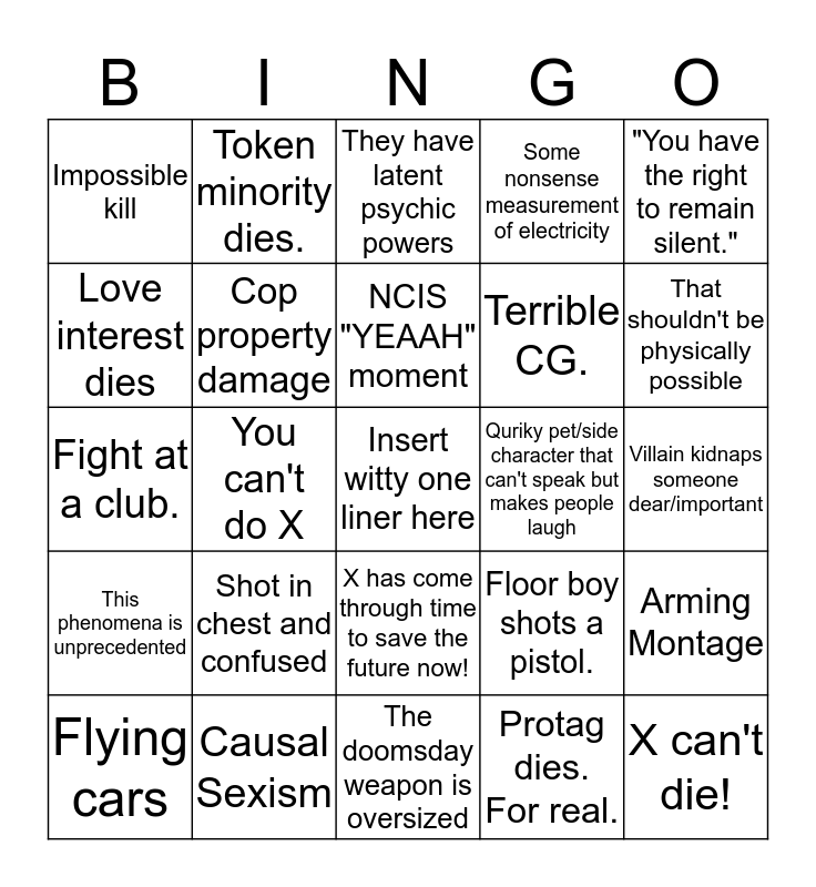 This bingo card has a free space and 37 words: Infinite Ammo, Death Montage, Gag Death, Cop property damage, Arming Montage, Shot in chest and confused, NCIS "YEAAH" moment, Drift to stop car, "You have the right to remain silent.", X isn't what you think it is, You can't do X, Some nonsense measurement of electricity, X can't die!, Villain kidnaps someone dear/important, Love interest dies, This phenomena is unprecedented, The villain monologues, They have latent psychic powers, X has come through time to save the future now!, Quriky pet/side character that can't speak but makes people laugh, Impossible kill, That shouldn't be physically possible, Flying cars, The doomsday weapon is oversized, I promised X I was done, Protag dies. For real., Token minority dies., A funeral., Protag commits war crimes., Protag can easily carry over 100lbs of guns., “Not now honey”, Causal Sexism, Fight at a club., Science-y Mumble Jumble, Floor boy shots a pistol., Terrible CG. and Twist! Token minority is a traitor..