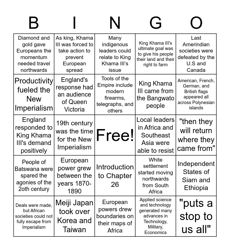 This bingo card has a free space and 24 words: European power grew between the years 1870-1890, Meiji Japan took over Korea and Taiwan, Tools of the Empire include modern firearms, telegraphs, and others, Deals were made, but African societies could not fully escape from Imperialism, Last Amerindian societies were defeated by the U.S and Canada, Diamond and gold gave Europeans the momentum needed travel northwards, Productivity fueled the New Imperialism, As king, Khama III was forced to take action to prevent European spread, Local leaders in Africa and Southeast Asia were able to resist, Introduction to Chapter 26, King Khama III came from the Bangwato people, England responded to King Khama III's demand positively, White settlement started moving northwards from South Africa, Independent States of Siam and Ethiopia, England's response had an audience of Queen Victoria, Applied science and technology generated many advances in Technology, Military, Economics, "then they will return where they came from", Many indigenous leaders could relate to King Khama III’s issue, American, French, German, and British flags appeared all across Polynesian islands, 19th century was the time for the New Imperialism, "puts a stop to us all", People of Batswana were spared the agonies of the 2oth century, King Khama III's ultimate goal was to give his people their land and their right to farm and European powers drew boundaries on their maps of Africa.