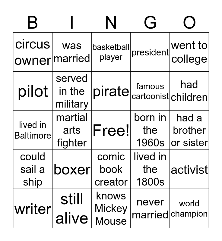 This bingo card has a free space and 24 words: writer, boxer, pirate, never married, went to college, circus owner, was married, basketball player, born in the 1960s, had a brother or sister, lived in Baltimore, served in the military, lived in the 1800s, activist, pilot, still alive, knows Mickey Mouse, president, had children, could sail a ship, martial arts fighter, comic book creator, famous cartoonist and world champion.