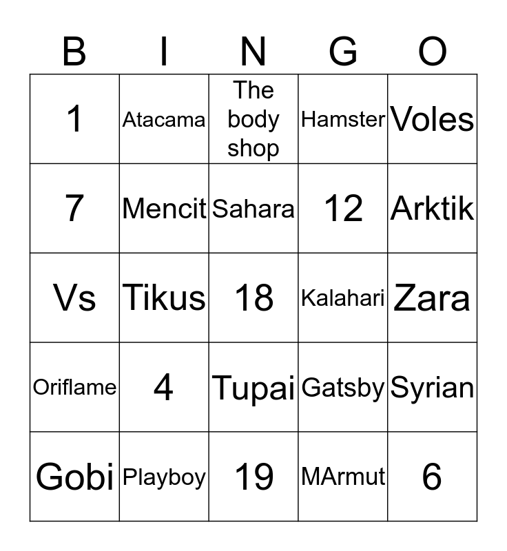 This bingo card has 25 words: 4, 19, Sahara, Gobi, Voles, 1, 7, Atacama, Kalahari, Tupai, 12, Vs, Gatsby, Syrian, Mencit, 6, Zara, The body shop, Arktik, Tikus, 18, Playboy, Oriflame, Hamster and MArmut.
