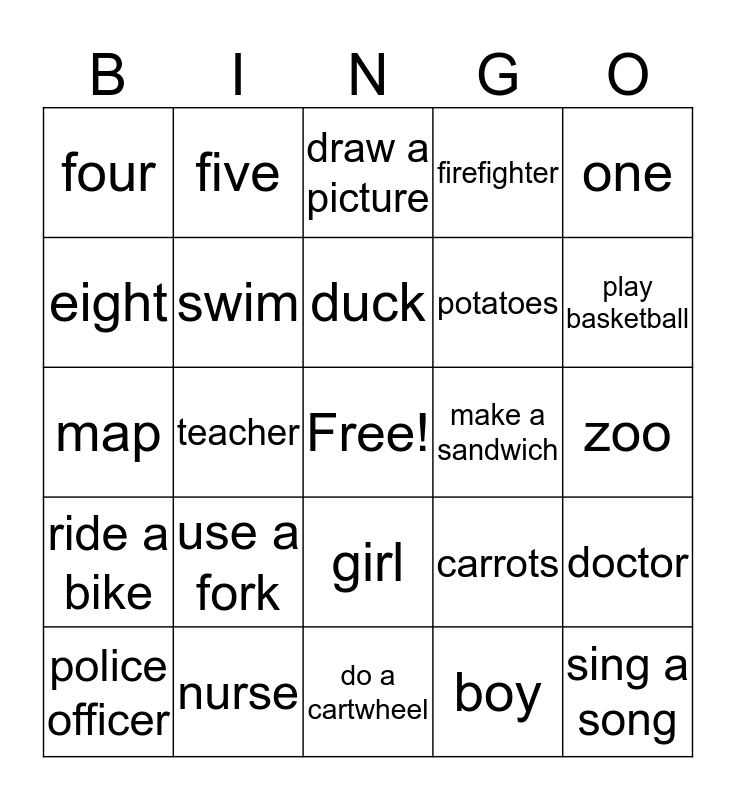 This bingo card has a free space and 26 words: girl, boy, duck, nurse, one, four, eight, five, zoo, carrots, potatoes, map, doctor, police officer, teacher, mail carrier, firefighter, ride a bike, draw a picture, sing a song, play basketball, do a cartwheel, make a sandwich, use a fork, swim and play the guitar.