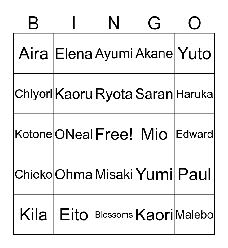 This bingo card has a free space and 24 words: Ohma, Eito, Ryota, Kila, Yuto, Aira, Chiyori, Elena, Mio, Misaki, Saran, Kotone, Yumi, Paul, Kaoru, Kaori, Edward, Ayumi, Haruka, ONeal, Malebo, Chieko, Akane and Blossoms.