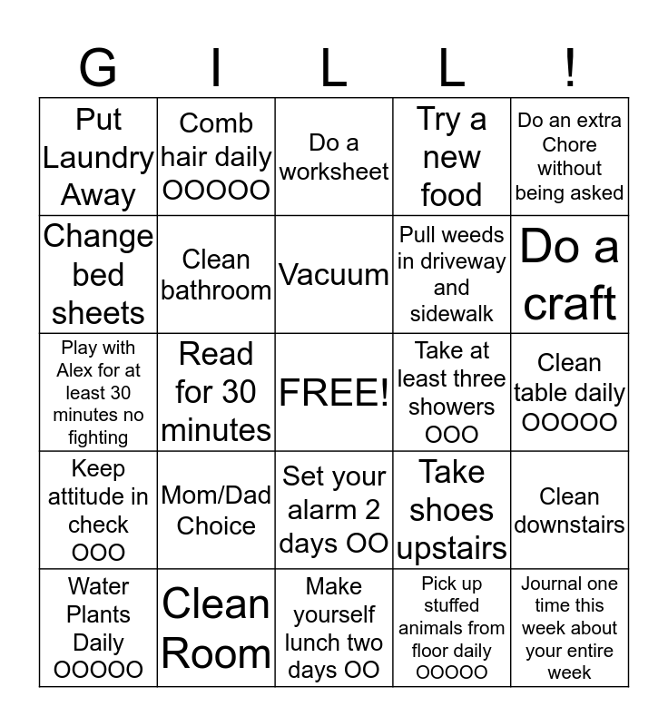 This bingo card has a free space and 24 words: Mom/Dad Choice, Clean Room, Vacuum, Water Plants Daily OOOOO, Do an extra Chore without being asked, Put Laundry Away, Change bed sheets, Comb hair daily OOOOO, Take at least three showers OOO, Set your alarm 2 days OO, Pull weeds in driveway and sidewalk, Play with Alex for at least 30 minutes no fighting, Take shoes upstairs, Clean downstairs, Clean bathroom, Pick up stuffed animals from floor daily OOOOO, Clean table daily OOOOO, Do a worksheet, Do a craft, Read for 30 minutes, Journal one time this week about your entire week, Keep attitude in check OOO, Try a new food and Make yourself lunch two days OO.