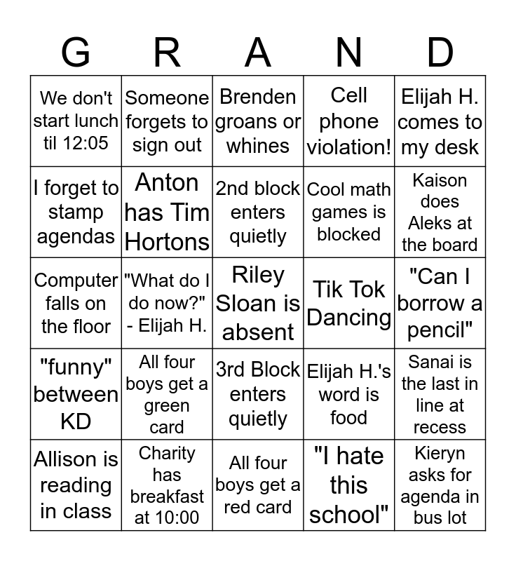 This bingo card has a free space and 24 words: All four boys get a green card, Charity has breakfast at 10:00, 2nd block enters quietly, Allison is reading in class, Elijah H. comes to my desk, We don't start lunch til 12:05, I forget to stamp agendas, Someone forgets to sign out, Tik Tok Dancing, 3rd Block enters quietly, Cool math games is blocked, Computer falls on the floor, Elijah H.'s word is food, Sanai is the last in line at recess, Anton has Tim Hortons, "I hate this school", "Can I borrow a pencil", Brenden groans or whines, Kaison does Aleks at the board, "What do I do now?" - Elijah H., Kieryn asks for agenda in bus lot, "funny" between KD, Cell phone violation! and All four boys get a red card.