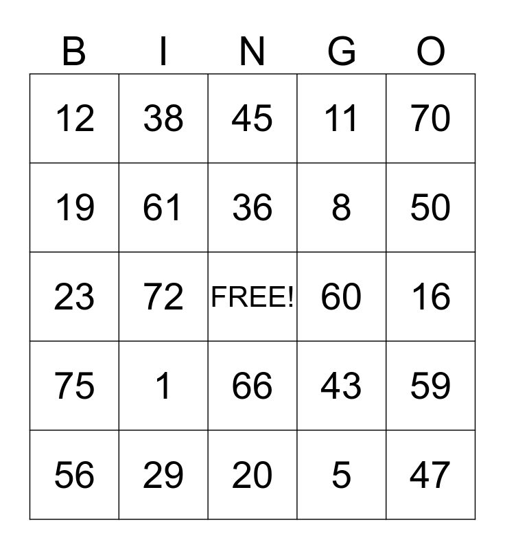 This bingo card has a free space and 24 words: 1, 29, 36, 56, 70, 12, 19, 38, 60, 66, 8, 23, 43, 59, 61, 5, 16, 45, 50, 72, 47, 75, 11 and 20.