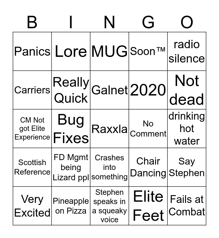 This bingo card has 28 words: Say Stephen, PVP, 2020, Elite Feet, Carriers, MUG, Lore, Scottish Reference, No Comment, Very Excited, CM Not got Elite Experience, Soon™️, Pineapple on Pizza, Stephen speaks in a squeaky voice, Not dead, Working very hard, FD Mgmt being Lizard ppl, Really Quick, Galnet, Crashes into something, Panics, Fails at Combat, Raxxla, Bug Fixes, drinking hot water, Chair Dancing, radio silence and ARX.