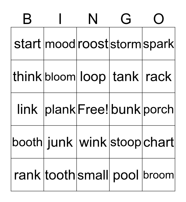 This bingo card has a free space and 54 words: sink, booth, sharp, soon, wink, stall, storm, food, think, bank, start, moon, tooth, rank, fork, small, broom, tank, honk, porch, stoop, spoon, bunk, spark, yard, mood, chunk, blink, bring, pool, tool, stink, sport, thing, roost, drink, link, chart, troop, bloom, mink, charm, clock, gloom, junk, thank, thick, proof, loop, plank, rack, smell, zoo and punk.