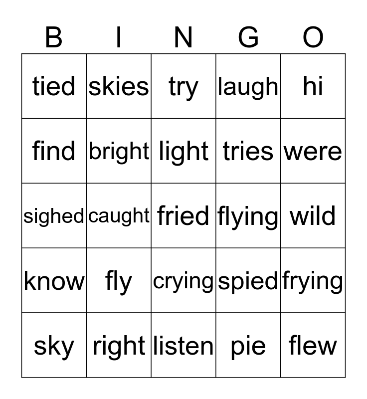 This bingo card has a free space and 24 words: fly, right, light, sky, hi, tied, find, skies, flying, crying, tries, sighed, spied, frying, bright, pie, wild, try, were, caught, flew, know, laugh and listen.