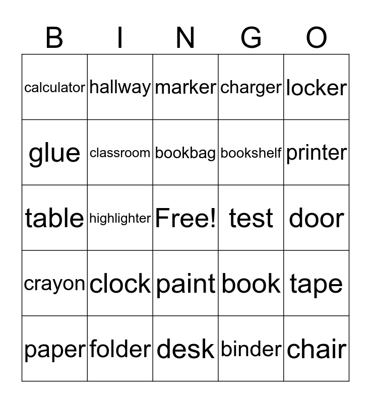 This bingo card has a free space and 24 words: paper, clock, bookbag, binder, locker, calculator, hallway, marker, test, door, table, classroom, book, tape, glue, folder, desk, charger, printer, crayon, highlighter, paint, bookshelf and chair.
