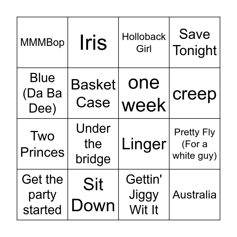 This bingo card has 28 words: What's up?, Mr. Jones, Two Princes, All I Wanna Do, Basket Case, Holloback Girl, Iris, Australia, Sit Down, Torn, Linger, Save Tonight, Ironic, Lovefool, Under the bridge, semi-charmed life, truly madly deeply, one week, creep, kiss from a rose, MMMBop, Waterfalls, Get the party started, Pretty Fly (For a white guy), Gettin' Jiggy Wit It, Wannabe, Blue (Da Ba Dee) and All Rise.
