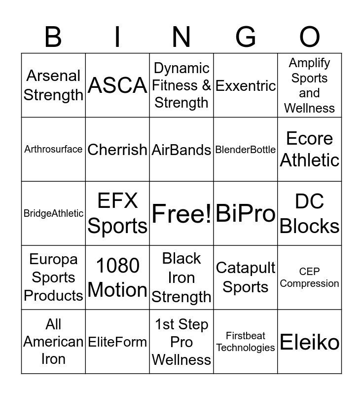 This bingo card has a free space and 25 words: 1080 Motion, 1st Step Pro Wellness, AirBands, All American Iron, Amplify Sports and Wellness, Arsenal Strength, Arthrosurface, ASCA, BiPro, Black Iron Strength, BlenderBottle, BridgeAthletic, Catapult Sports, CEP Compression, Cherrish, CryoUSA, DC Blocks, Dynamic Fitness & Strength, Ecore Athletic, EFX Sports, Eleiko, EliteForm, Europa Sports Products, Exxentric and Firstbeat Technologies.