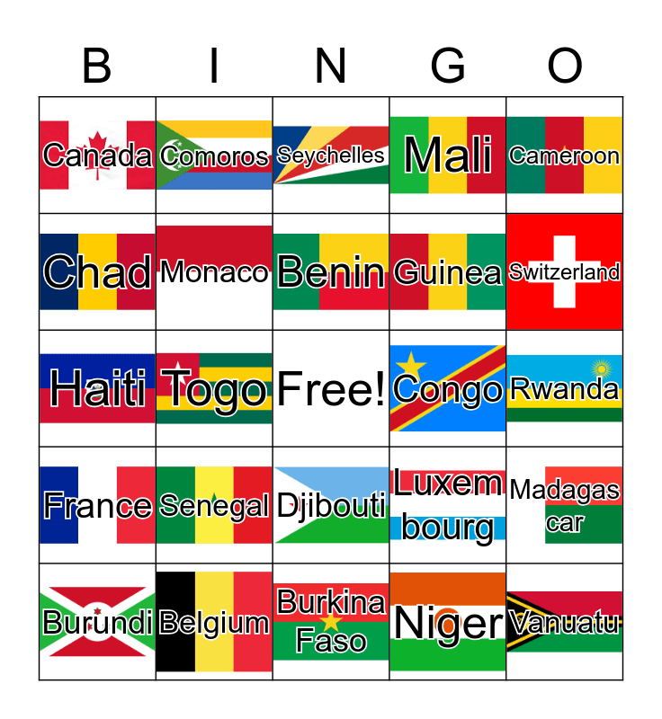 This bingo card has 24 images, a free space and 24 words: Senegal, Belgium, Benin, Burundi, Cameroon, Canada, Chad, Comoros, Congo, Djibouti, Guinea, Haiti, Luxem bourg, Madagas car, Monaco, Niger, Rwanda, Seychelles, Switzerland, Togo, Vanuatu, France, Mali and Burkina Faso.