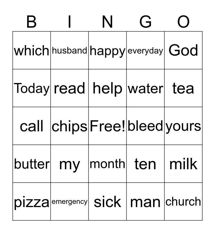This bingo card has a free space and 59 words: medicine, emergency, doctor, butter, man, woman, read, walk, water, coffee, everyday, Monday, Today, Saturday, why, which, church, God, good, help, bleed, happy, pizza, milk, chocolate, potato, apple, banana, tea, banana, tea, week, Wednesday, wife, husband, hamburger, hotdog, chips, cookie, call, name, my, yours, how, fish, hurt, nurse, friend, month, sick, dizzy, see, write, say, three, ten, where, when and who.