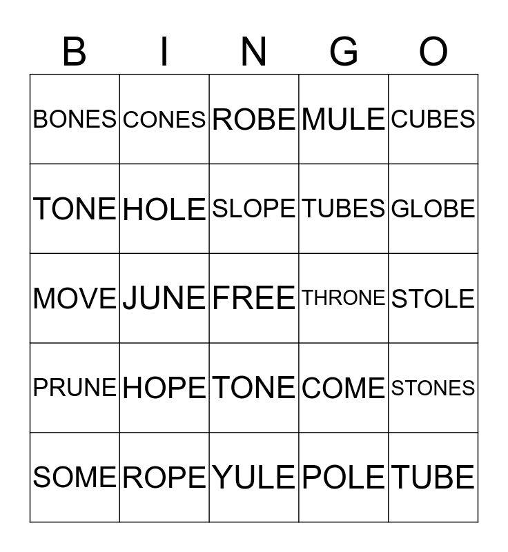 This bingo card has a free space and 24 words: HOPE, ROPE, SLOPE, SOME, CUBES, BONES, TONE, CONES, THRONE, TONE, TUBES, MOVE, COME, STONES, HOLE, POLE, STOLE, ROBE, GLOBE, JUNE, TUBE, PRUNE, MULE and YULE.