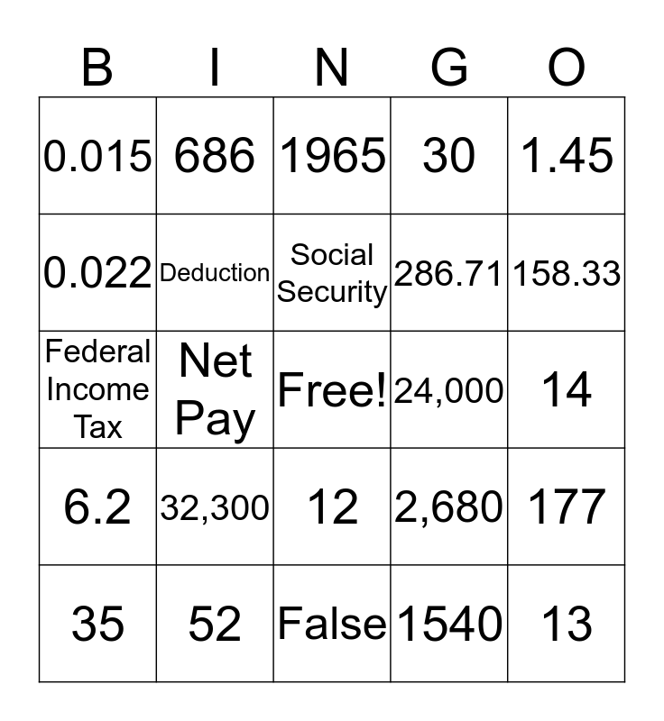 This bingo card has a free space and 40 words: Taxable Income, Federal Income Tax, Graduated, Deduction, 52, 12, Social Security, Medicare, 1.45, 6.2, Net Pay, 30, 13, 14, 24,000, 32,300, 0.15, 0.015, 550.40, 1965, 177, 1540, 286.71, 0.022, 40.18, 0, 7.63, 5.08, Semi-monthly, Biweekly, Employee, 35, 20, 2,680, 158.33, False, True, March 10, 686 and 431.75.