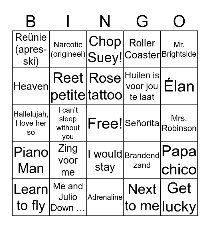 This bingo card has a free space and 115 words: Pa Olvidarte, Oceaan, Leef, Proosten, Wêr Bisto, Atje voor de sfeer, Roller Coaster, Waitin’on a sunny day, Things we lost in the fire, Island, Bed of Roses, Losing my religion, If you can tolerate this…, Creep, Summer of ‘69, November Rain, I would stay, The ghost of Tom Joad, Friday I’m in love, The mercy seat, Learn to fly, Chop Suey!, Lemon tree, Africa, Sweet Caroline, Piano Man, Me and Julio Down …, Purple rain, Nobody’s wife, Proud Mary, Élan, Rose tattoo, I can’t sleep without you, Silenced by the night, One, Phantom of the opera, Thank you for the music, Avond, Mon amour, Pastorale, I will wait, The nights, Cut your teeth, Galway girl, The sound of silence, The last time, Next to me, Heaven, Year of summer, Wit Zwart, Het gevoel, Señorita, Reünie (origineel), Wake me up, Instagram, Terug naar toen, Dromen doe ik alleen van jou, Potentie, M’n favoriet, Alles wat ik wil, Papa chico, Skyfall, Ik kan het niet alleen, Je hoeft niet naar huis vannacht, Duurt te lang, You’ll never walk alone, Brabant, Reet petite, Hallelujah, I love her so, Breezeblocks, Mrs. Robinson, Father and son, Tiny dancer, Still young, One step beyond, Get lucky, Zing voor me, Reünie (apres-ski), Faye, Ze huilt maar ze lacht, Nacht, Narcotic (origineel), Sierra Madre, Brandend zand, Huilen is voor jou te laat, ’T is weer voorbij die mooie zomer, Twee motten, The wild rover, Liefde, Music, Uncharted, Used to love, Blood, Narcotic (Younotus), Mr. Brightside, Blinding lights, Alles nog open, Atemlos durch die nacht, Shallow, Dr zit n kras in de pl, Varkensmesterij, De bouw, Bettieakkemaai, Recht op en neer, Danza kuduro, Meneo, Payback, We own it, Adrenaline, Banger hart, Zij weet het, De Toreador, Kali, Dance Monkey and Zwemmen zonder slip.
