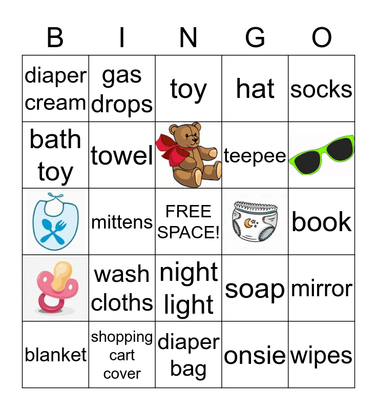 This bingo card has 10 images, a free space and 26 words: suction, towel, soap, clippers, socks, mittens, hat, teething ring, diaper cream, wash cloths, wipes, toy, book, mirror, shopping cart cover, blanket, diaper bag, gas drops, teepee, bath toy, pack 'n play, changing pad, onsie, night light, wipe warmer and swing.
