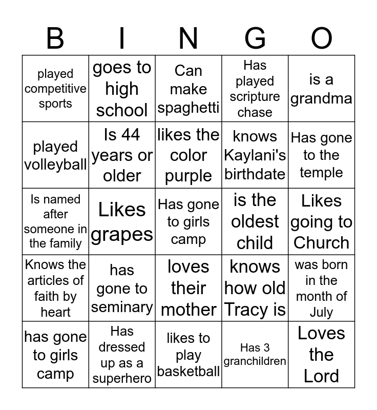 This bingo card has 25 words: has gone to seminary, likes to play basketball, likes the color purple, has gone to girls camp, is a grandma, played competitive sports, played volleyball, goes to high school, is the oldest child, loves their mother, knows Kaylani's birthdate, Is named after someone in the family, knows how old Tracy is, was born in the month of July, Is 44 years or older, Loves the Lord, Likes going to Church, Can make spaghetti, Has gone to the temple, Likes grapes, Has gone to girls camp, Has dressed up as a superhero, Knows the articles of faith by heart, Has played scripture chase and Has 3 granchildren.