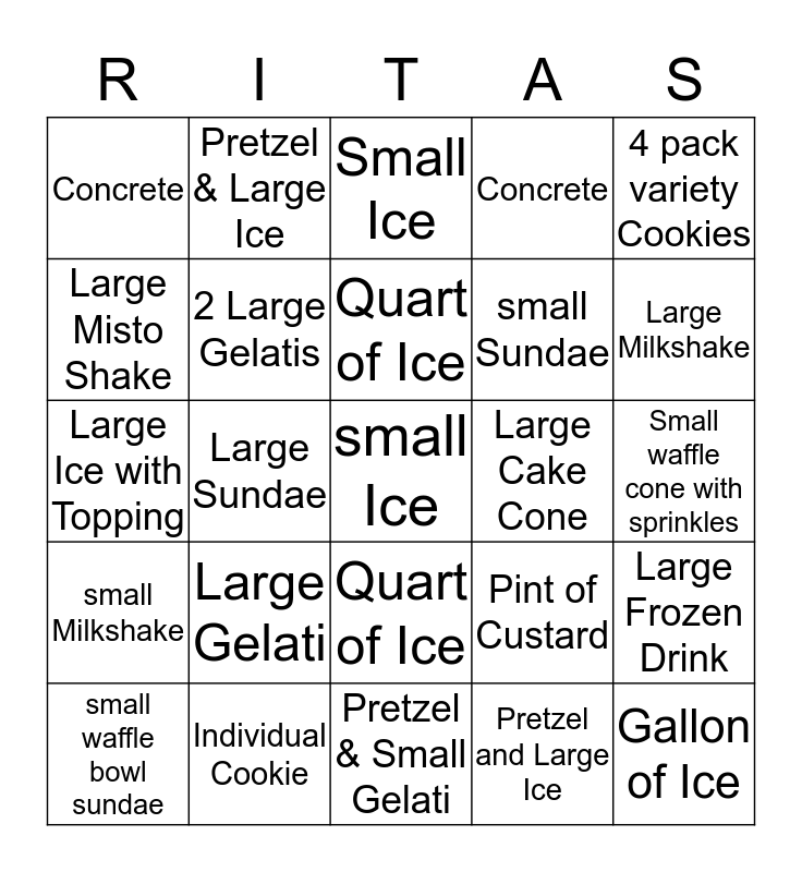 This bingo card has 25 words: Large Gelati, Pretzel & Small Gelati, Quart of Ice, small waffle bowl sundae, 4 pack variety Cookies, Concrete, Large Misto Shake, Pretzel & Large Ice, Large Cake Cone, Quart of Ice, small Sundae, Large Ice with Topping, Pint of Custard, Large Frozen Drink, 2 Large Gelatis, Gallon of Ice, Small waffle cone with sprinkles, Small Ice, Large Milkshake, Large Sundae, small Ice, Individual Cookie, small Milkshake, Concrete and Pretzel and Large Ice.