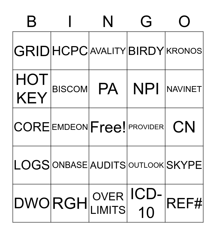 This bingo card has a free space and 24 words: ONBASE, RGH, PA, DWO, KRONOS, GRID, HOT KEY, HCPC, PROVIDER, AUDITS, NPI, CORE, OUTLOOK, SKYPE, BISCOM, ICD-10, CN, AVALITY, NAVINET, EMDEON, REF#, LOGS, BIRDY and OVER LIMITS.