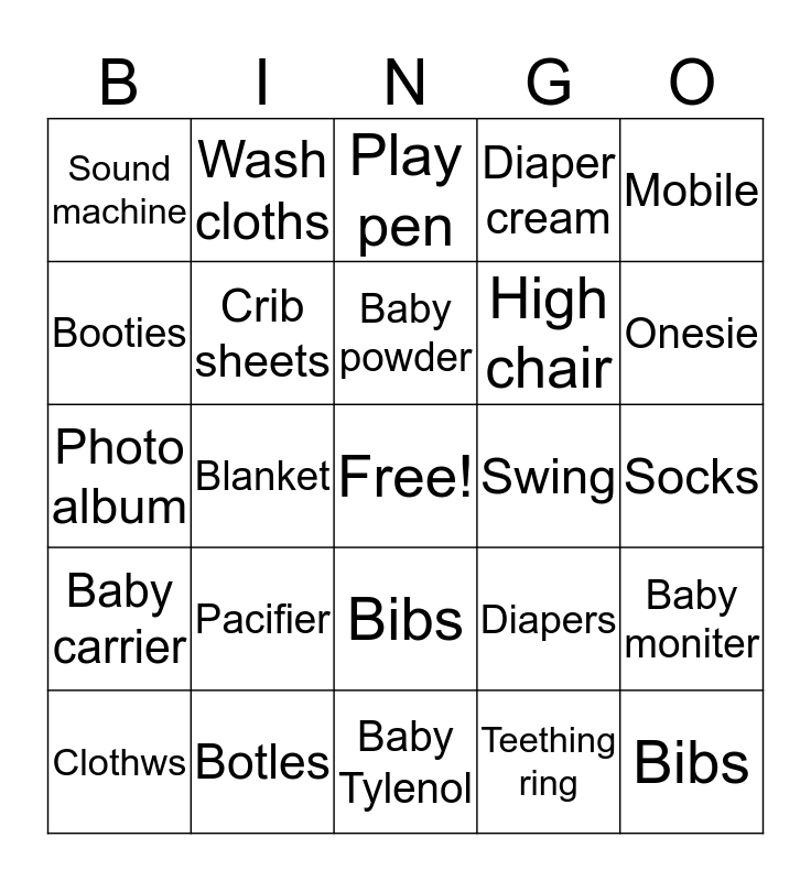 This bingo card has a free space and 24 words: Pacifier, Botles, Baby powder, Clothws, Mobile, Sound machine, Booties, Wash cloths, Swing, Bibs, High chair, Photo album, Diapers, Baby moniter, Crib sheets, Teething ring, Socks, Play pen, Onesie, Blanket, Bibs, Baby carrier, Diaper cream and Baby Tylenol.