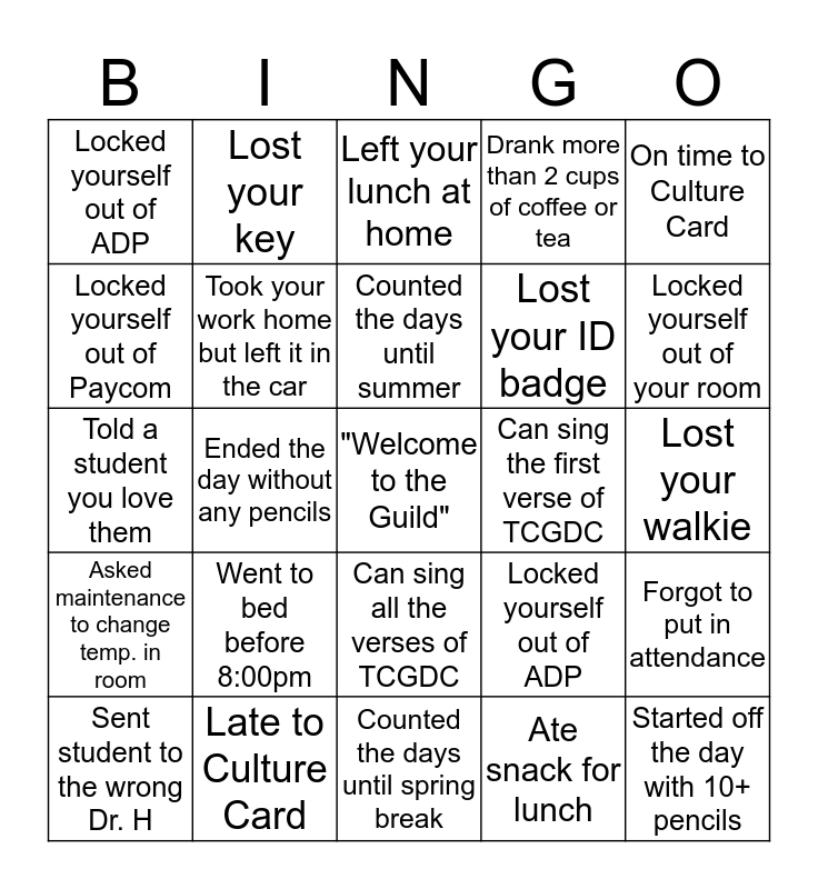 This bingo card has a free space and 24 words: Went to bed before 8:00pm, Late to Culture Card, Counted the days until summer, Sent student to the wrong Dr. H, On time to Culture Card, Locked yourself out of ADP, Locked yourself out of Paycom, Lost your key, Can sing the first verse of TCGDC, Can sing all the verses of TCGDC, Lost your ID badge, Told a student you love them, Locked yourself out of ADP, Forgot to put in attendance, Took your work home but left it in the car, Ate snack for lunch, Lost your walkie, Left your lunch at home, Locked yourself out of your room, Ended the day without any pencils, Started off the day with 10+ pencils, Asked maintenance to change temp. in room, Drank more than 2 cups of coffee or tea and Counted the days until spring break.