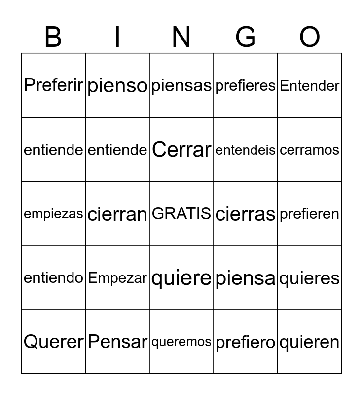 This bingo card has a free space and 24 words: Empezar, Pensar, Cerrar, Querer, Entender, Preferir, entiende, pienso, cierras, quiere, entendeis, empiezas, piensa, quieres, entiende, prefiero, prefieren, piensas, cerramos, cierran, quieren, entiendo, prefieres and queremos.