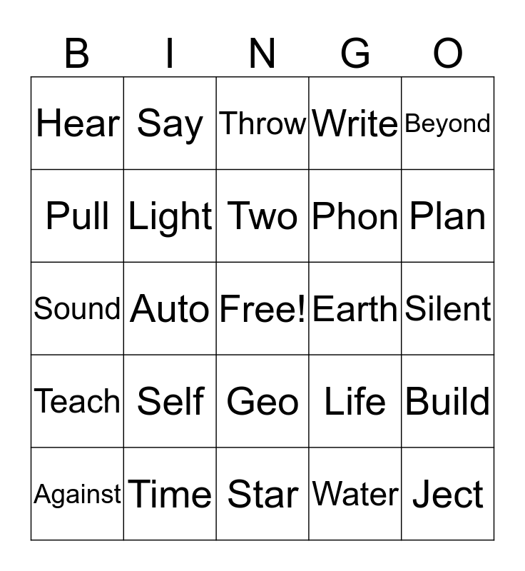 This bingo card has a free space and 24 words: Against, Self, Two, Water, Beyond, Hear, Say, Throw, Earth, Silent, Sound, Light, Life, Build, Pull, Time, Star, Write, Plan, Teach, Auto, Geo, Phon and Ject.