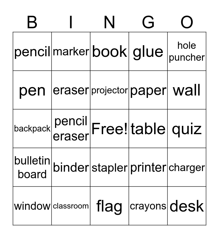 This bingo card has a free space and 24 words: binder, classroom, projector, window, hole puncher, pencil, pen, marker, table, stapler, paper, backpack, printer, charger, eraser, crayons, quiz, book, wall, pencil eraser, desk, bulletin board, glue and flag.