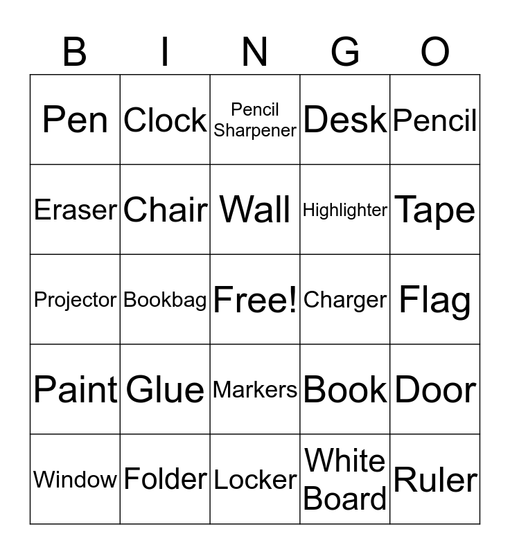 This bingo card has a free space and 24 words: Glue, Folder, Wall, Window, Pencil, Pen, Eraser, Clock, Charger, Markers, Highlighter, Projector, Book, Door, Chair, White Board, Flag, Pencil Sharpener, Tape, Bookbag, Ruler, Paint, Desk and Locker.