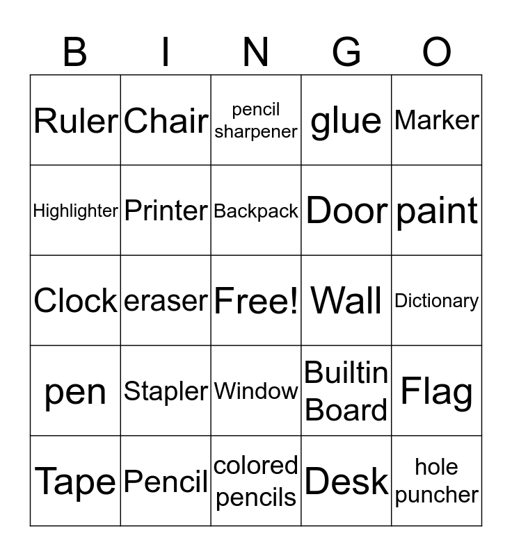 This bingo card has a free space and 24 words: Stapler, Pencil, Backpack, Tape, Marker, Ruler, Highlighter, Chair, Wall, Window, Door, Clock, Builtin Board, Flag, Printer, Desk, Dictionary, pencil sharpener, paint, eraser, hole puncher, pen, glue and colored pencils.