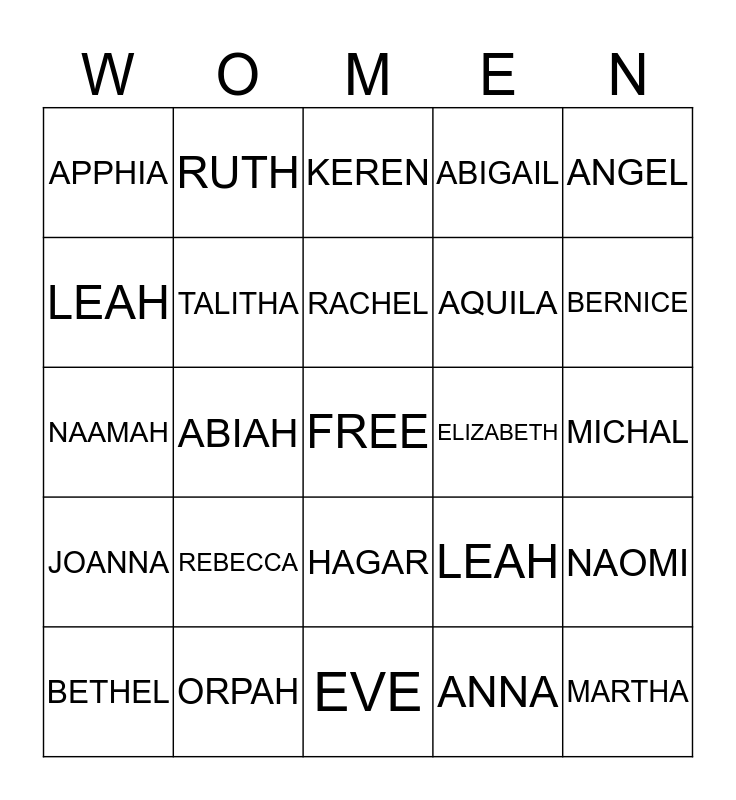 This bingo card has a free space and 49 words: ESTHER, MARTHA, MARY, EVE, REBECCA, HANNAH, RUTH, DEBORAH, LEAH, SARA, TALITHA, ABIGAIL, NAOMI, LEAH, DELILAH, SHILOH, RACHEL, ELIZABETH, BETHANY, ANGEL, ABIAH, ANNA, APPHIA, AQUILA, BATHSHEBA, BERNICE, BETHEL, DELILAH, HAGAR, JOANNA, LYDIA, MIRIAM, VASHTI, RACHEL, ORPAH, RHODA, PHEBE, MARIE, MICHAL, MIRIAM, TABITHA, TIRZAH, PRISCA, SELAH, NAAMAH, KEREN, JULIA, JAWAD and BEULAH.
