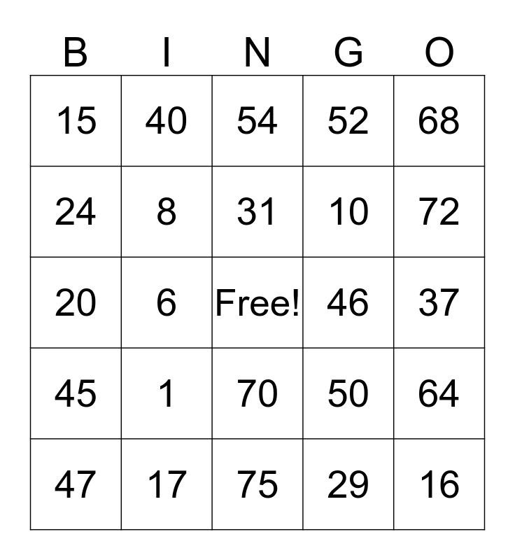 This bingo card has a free space and 24 words: 1, 17, 31, 47, 68, 15, 24, 40, 46, 70, 10, 20, 50, 64, 8, 29, 37, 54, 72, 6, 16, 45, 52 and 75.