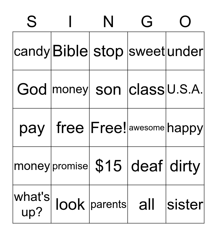 This bingo card has a free space and 49 words: church, sister, color, parents, promise, dog, Bible, beautiful, God, tease, money, sweet, dirty, deaf, favorite, name, son, awesome, mistake, under, free, all, candy, class, correct/ right, U.S.A., what's up?, like, $15, money, 1 cent, sign, blue, black, look, thank you, fine, number, happy, old, good, sleep, red, chair, pay, stop, pay attention, love and mountian.