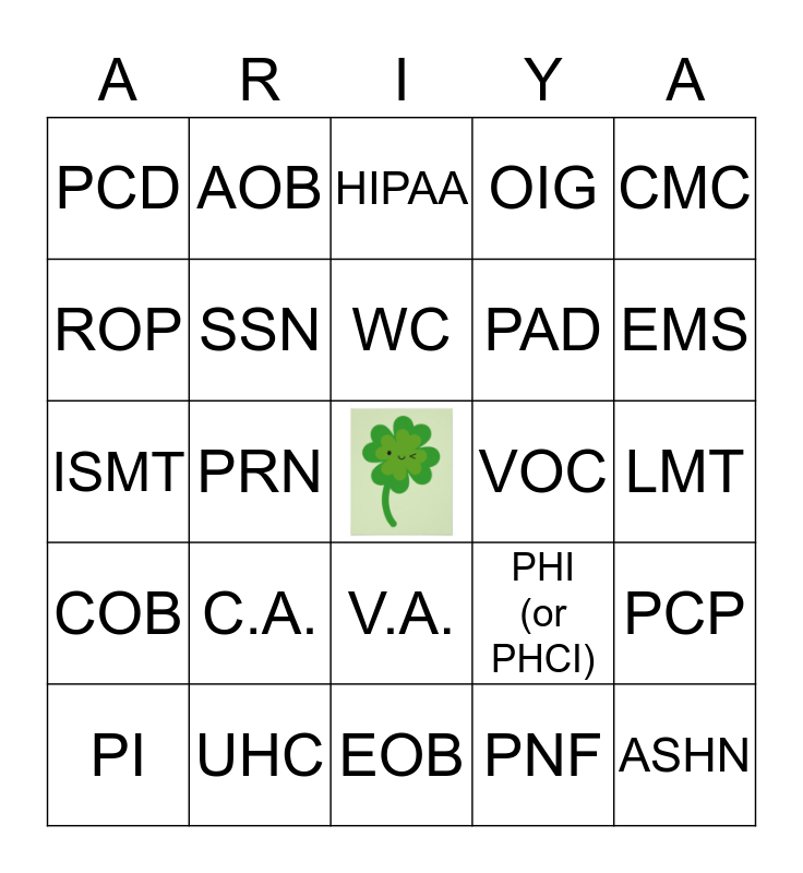 This bingo card has a free space and 24 words: C.A., UHC, WC, PI, CMC, PCD, ROP, AOB, VOC, V.A., PAD, ISMT, PHI (or PHCI), PCP, SSN, PNF, LMT, HIPAA, EMS, PRN, ASHN, COB, OIG and EOB.