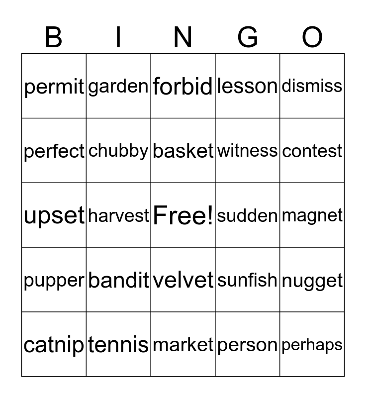 This bingo card has a free space and 24 words: bandit, tennis, basket, catnip, dismiss, permit, perfect, garden, sudden, velvet, witness, upset, sunfish, nugget, chubby, person, magnet, forbid, contest, harvest, perhaps, pupper, lesson and market.