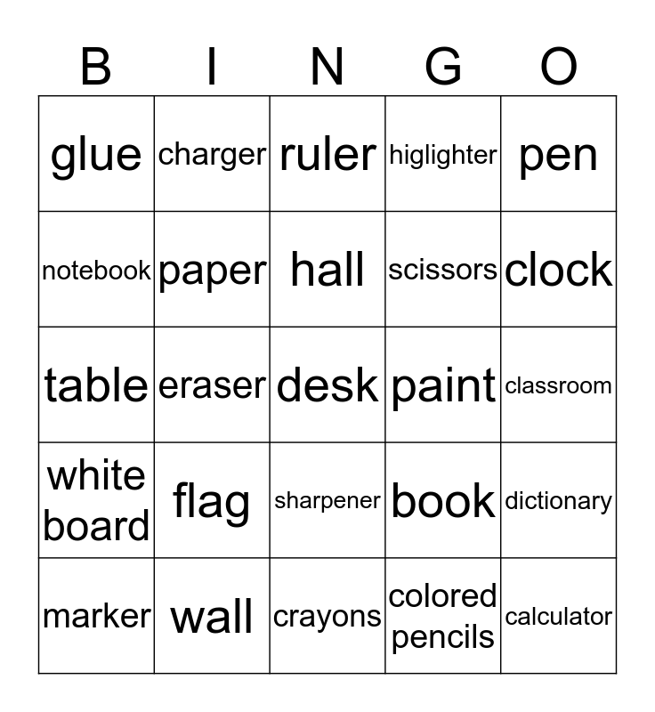 This bingo card has a free space and 24 words: flag, wall, hall, marker, pen, glue, notebook, charger, paint, sharpener, scissors, table, book, dictionary, paper, colored pencils, classroom, ruler, clock, eraser, calculator, white board, higlighter and crayons.