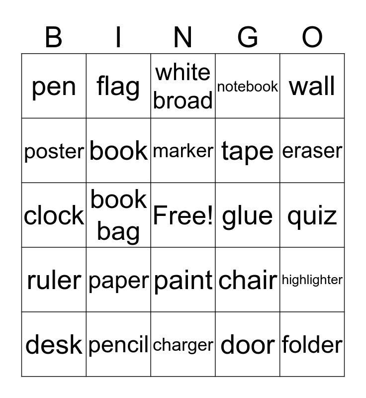 This bingo card has a free space and 24 words: paper, pencil, marker, desk, wall, pen, poster, flag, glue, paint, tape, clock, chair, highlighter, book, door, quiz, white broad, eraser, book bag, folder, ruler, notebook and charger.