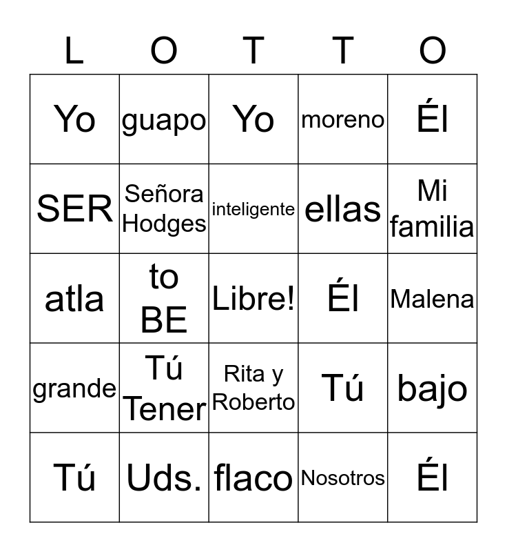 This bingo card has a free space and 29 words: Tú, callada, to BE, Levi y Yo, Yo, Yo, Señora Hodges, Tú Tener, Él, Uds., Malena, Él, flaco, Nosotros, Mi familia, Yo, Rita y Roberto, grande, Él, atla, Tú, yo, ellas, SER, moreno, guapo, bajo, inteligente and divertida.