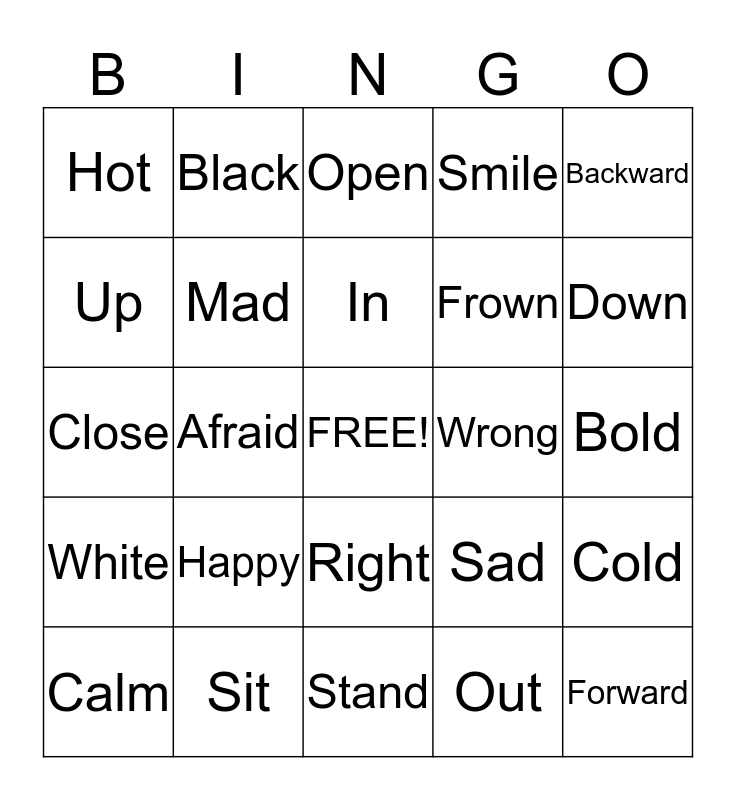 This bingo card has a free space and 24 words: Happy, Sit, In, Calm, Backward, Hot, Up, Black, Wrong, Right, Frown, Close, Sad, Cold, Mad, Out, Bold, Open, Down, Afraid, Forward, White, Smile and Stand.
