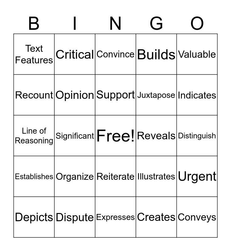 This bingo card has a free space and 40 words: Format, Line of Reasoning, Sequence, Opinion, Dispute, Reiterate, Support, Summarize, Valuable, Establishes, Significant, Builds, Conveys, Distinguish, Reveals, Organize, Statement, Text Features, Argument, Convince, Urgent, Creates, Juxtapose, Recount, Describe, Central, Justify, Show Evidence, Arranged, Idea, Demonstrates, Depicts, Portrays, Illustrates, Indicates, Expresses, Reveals, Differentiate, Critical and Relevant.